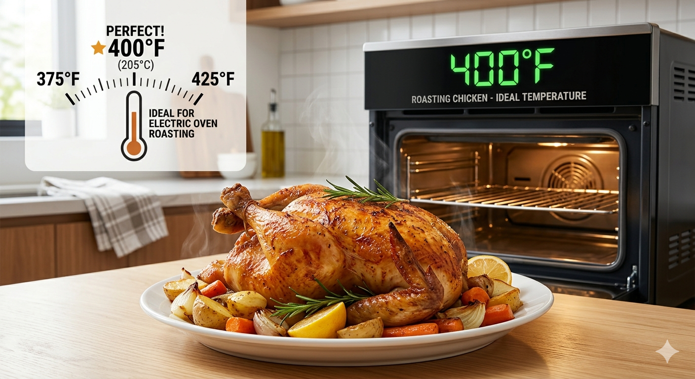 The ideal electric oven temperature for roasting chicken is 400°F (200°C) for a standard-sized whole bird to achieve the perfect balance of crispy skin and moist interior. While temperatures can range between 350°F and 450°F depending on the desired texture, 400°F provides consistent radiant heat in an electric environment, ensuring the fat renders efficiently without drying out the breast meat.